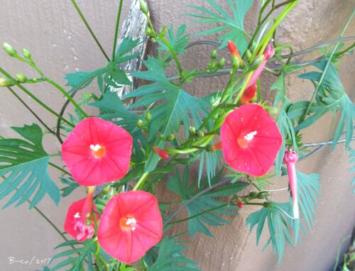 _ 今年初めて種を蒔いてみた カーディナル クライマーの花が満開 5月に種を蒔いて 7月初めの頃 この状態のまま 変化がほとんどない日が続く パッケージ写真とは 少し様子が違うし 3ヶ月経って やっと壁をつたい始めたけど 一向に花が咲く気配がない 今年の春…